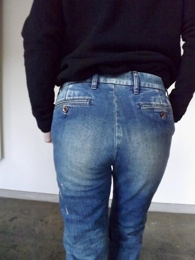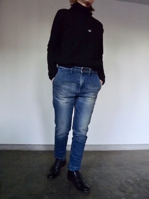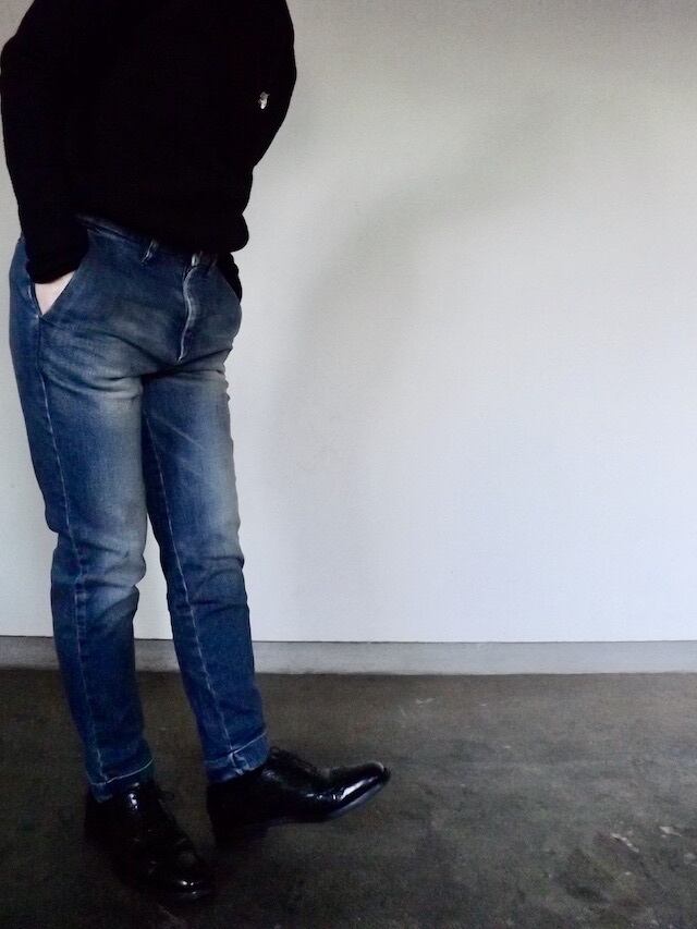 腰回り太ももはジャストフィット、ヒザからスソにかけてテーパードの入った