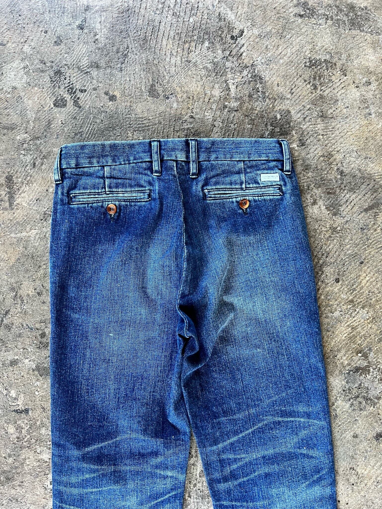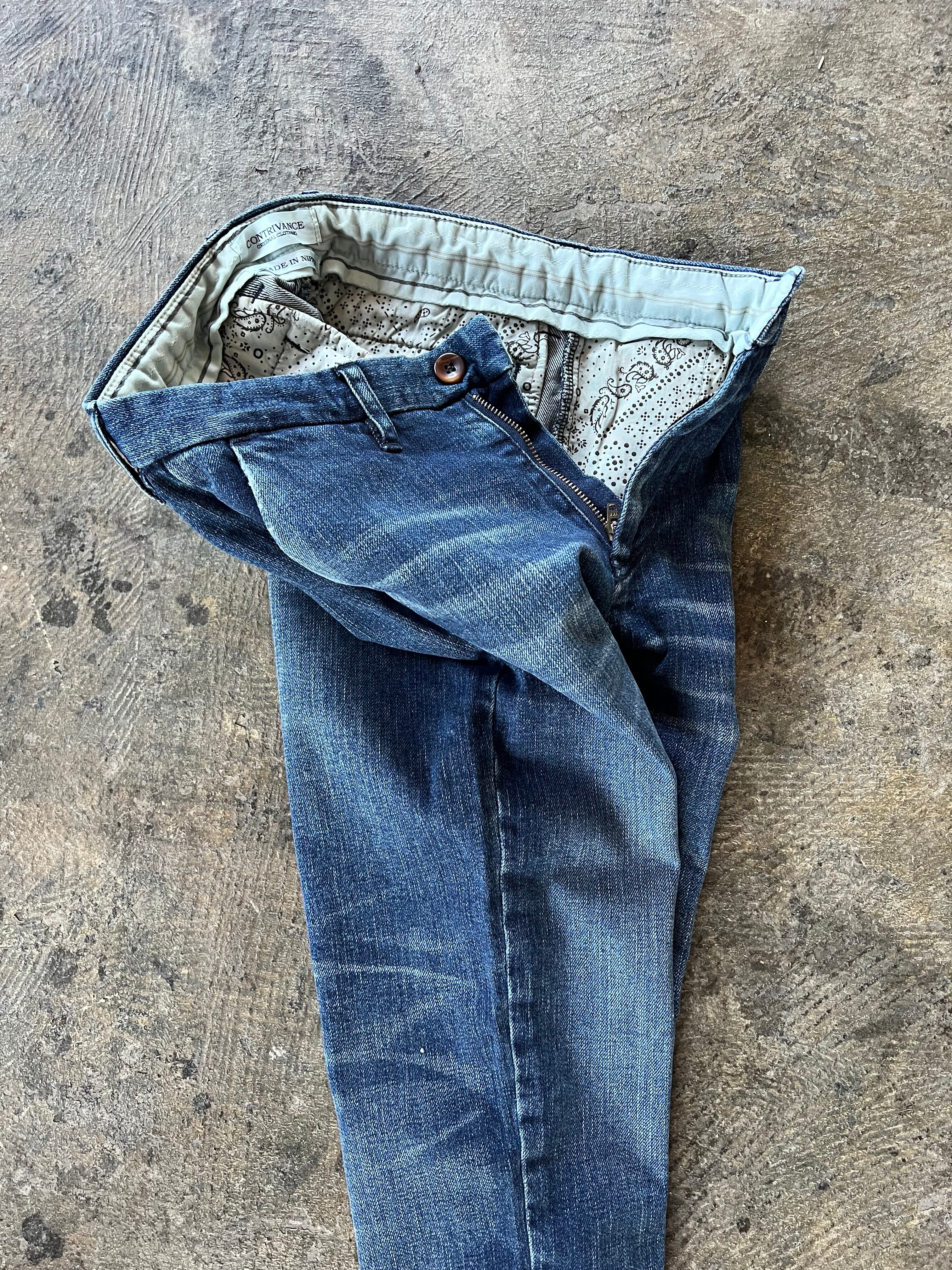 ジーンズでは珍しいベルト裏のテーラー仕立て、バンダナ柄を使ったポケット裏地がポイント